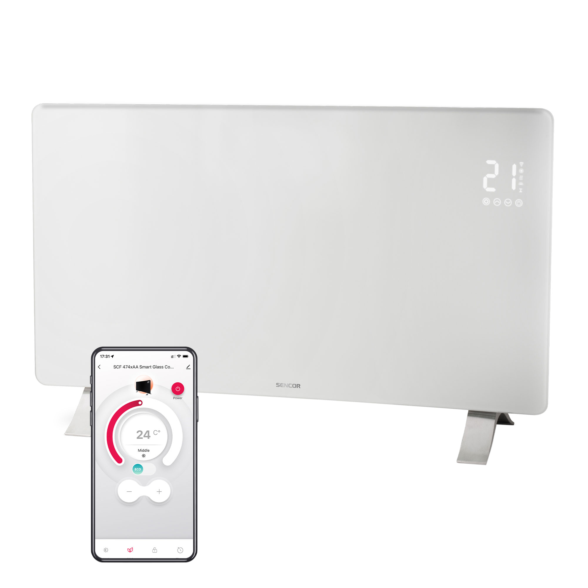 Απλά ρυθμίζετε τη θερμοκρασία που επιθυμείτε χρησιμοποιώντας τα στοιχεία χειρισμού αφής κάτω από την οθόνη της μονάδας θέρμανσης. Και σε περίπτωση που δεν μπορείτε να σηκωθείτε και να πάτε στον θερμαντήρα επειδή βλέπετε μια συναρπαστική ταινία ή δεν βρίσκεστε στο σπίτι, αλλά θέλετε να βρείτε τον χώρο ζεστό όταν επιστρέψετε, μπορείτε να κάνετε τις ρυθμίσεις σας από τον πίνακα ελέγχου στην εφαρμογή Sencor HOME. Έτσι όταν θα γυρίσετε στο σπίτι από τη δουλειά ή ένα ταξίδι, ο χώρος σας θα είναι ζεστός και ευχάριστος, και με την πρόσβαση στα δεδομένα μέσω τηλεφώνου, έχετε πάντοτε άμεση και ακριβή ενημέρωση για τη θερμοκρασία του χώρου.